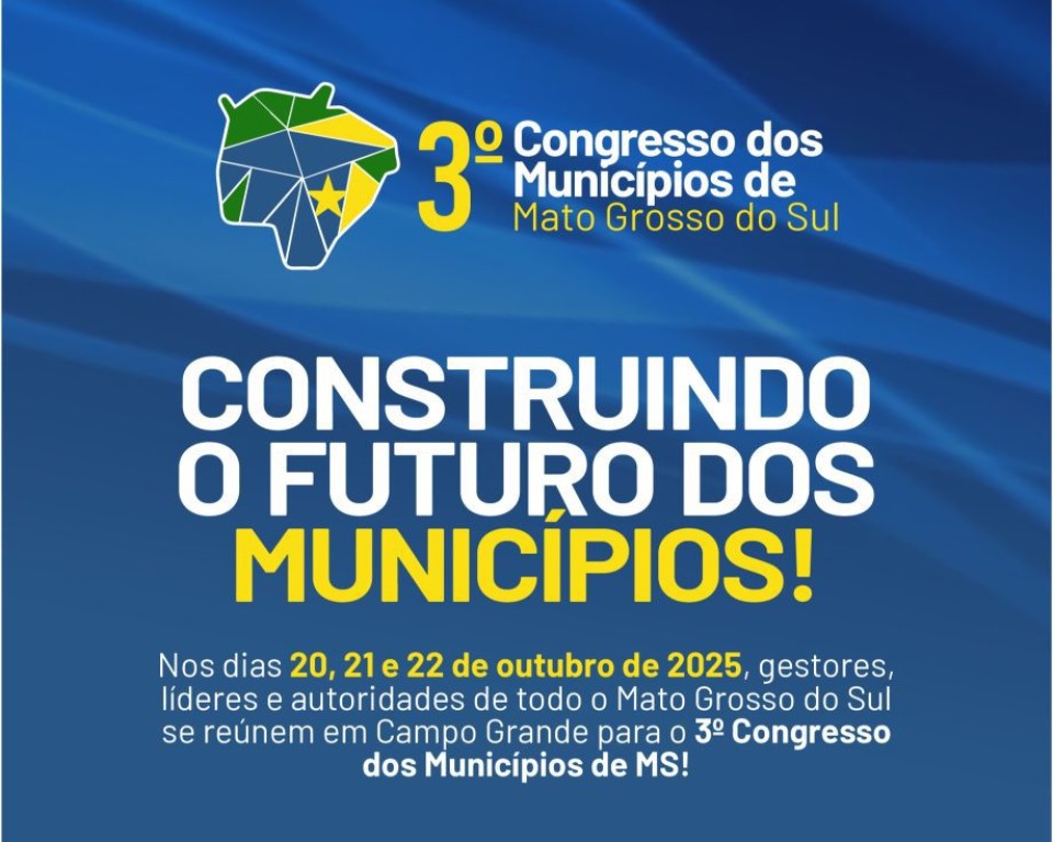 Considerado o maior evento municipalista do estado, o 3º Congresso dos Municípios de Mato Grosso do Sul será realizado nos dias 20, 21 e 22 de outubro de 2025, no Bosque Expo, em Campo Grande, e reunirá gestores, vereadores, técnicos e autoridades para discutir os rumos da gestão pública e promover o fortalecimento das administrações municipais diante dos desafios políticos, econômicos e sociais.
