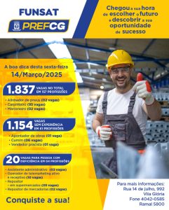 A Funsat (Fundação Social do Trabalho) oferece nesta sexta-feira (14) o total de 1.837 vagas. As oportunidades são em 195 empresas de Campo Grande para 157 profissões diferentes, sendo 61 funções com recrutamento sem exigência de experiência dos candidatos.