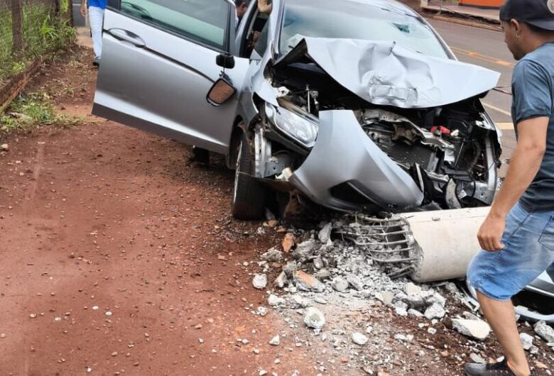 De acordo com informações iniciais, um veículo Honda Fit colidiu contra um poste, que caiu na via. O automóvel ficou com a parte frontal totalmente destruída.