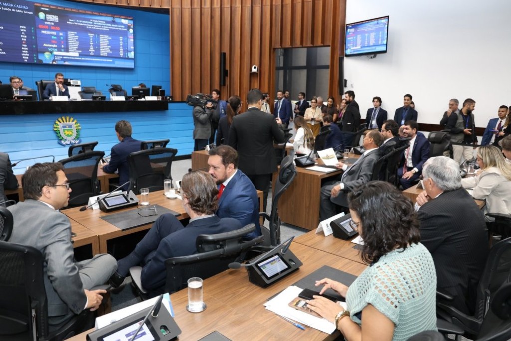 Plenário da ALEMS durante a sessão que aprovou os projetos 147/2025 e