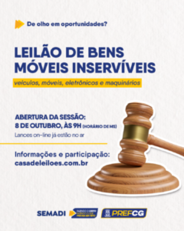 A Prefeitura de Campo Grande, por meio da Secretaria Especial de Licitações e Contratos (SELC) e da Secretaria Municipal de Administração e Inovação (Semadi), realiza no dia 8 de outubro de 2025 o Leilão Eletrônico nº 007/2025, destinado à alienação de bens móveis inservíveis pertencentes ao patrimônio público municipal.