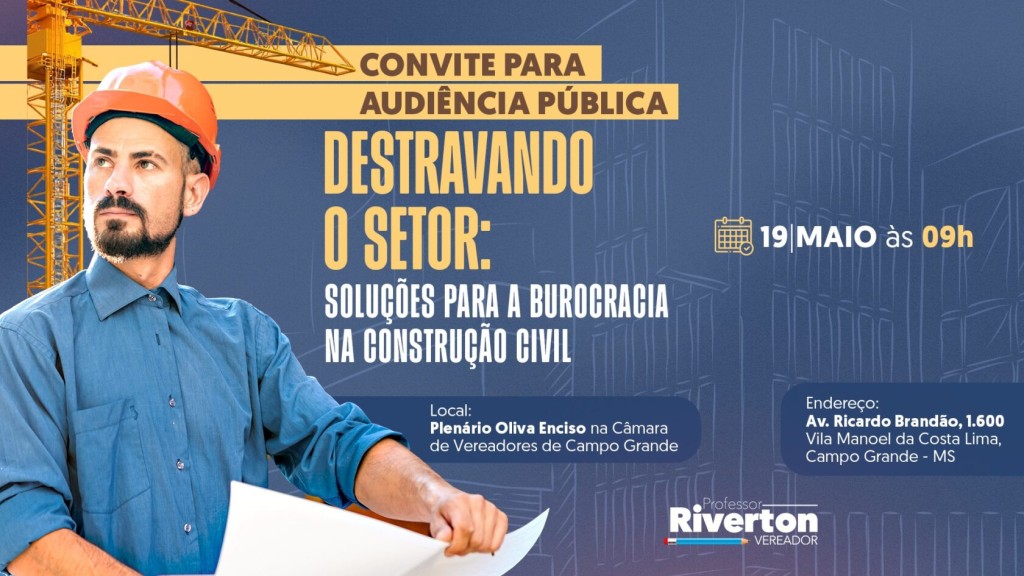 Na próxima segunda-feira, 19 de maio, às 9h, o vereador Professor Riverton promove na Câmara Municipal a audiência pública “Destravando o Setor: Soluções para a Burocracia na Construção Civil” — um evento que promete colocar frente a frente quem sofre na pele com a lentidão dos processos e quem tem o poder de mudar esse cenário.